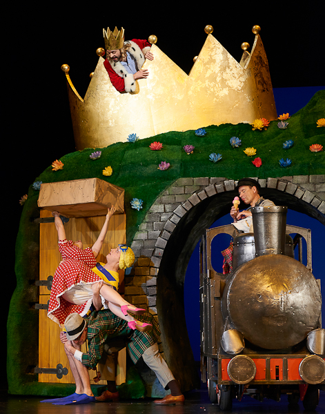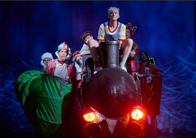 Jim Knopf (Joshua Seelenbinder) und Lukas (Matthias Schamberger) dampfen mit Emma und den Kindern zurück nach Mandala. Foto: Staatstheater Braunschweig / Thomas M. Jauk
