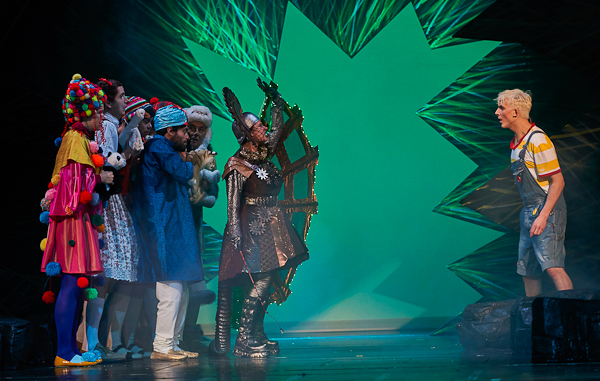 Jim Knopf fordert die gefangenen Kinder vom Drachen Frau Mahlzahn (Isabell Giebeler) zurück. Foto: Staatstheater Braunschweig / Thomas M. Jauk