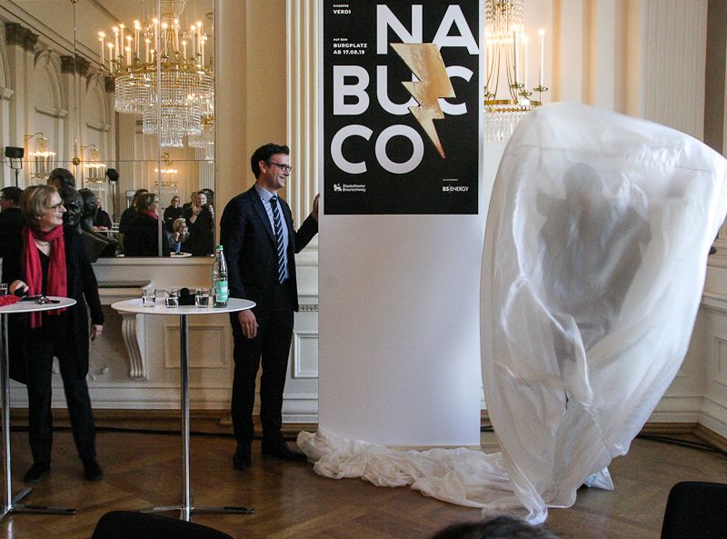 Missgeschick bei der Enthüllung des „Nabucco“-Plakats: Ausgerechnet der Regisseur verhüllte sich bei der Enthüllung des Plakats selbst. Foto: braunschweig-spiegel