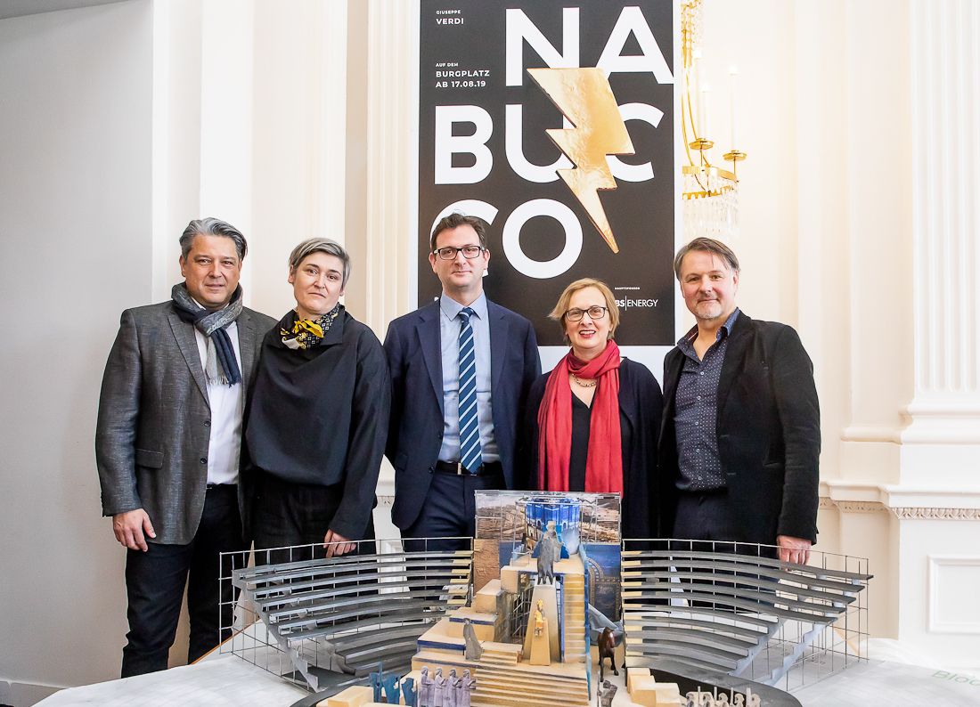 Zurück zu den Ursprüngen: Mit Verdis „Nabucco“ wollen Regisseur Klaus Schreiber, Generalintendantin Dagmar Schlingmann, BS-Energy-Vorstandsvorsitzender Julien Mounier, Bühnenbildnerin Corinna Gassauer und Generalmusikdirektor Srba Dinic (v.r.) eine grosse Inszenierung unter den Burglöwen legen. Foto: Staatstheater Braunschweig / Phillip Ziebart