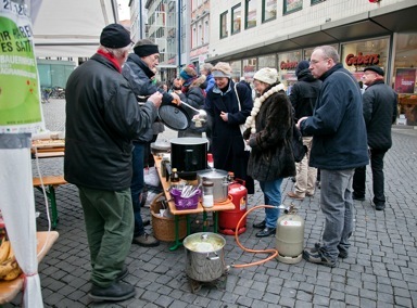 Am Samstag auf dem Kohlmarkt gab`s was zu essen. Essen aus der Mülltonne, von Slow Food Braunschweig organisiert (siehe B-S). Lebensmittel aus der Tonne nennt man „Containern“. Wir haben die Lebensmittel aus Containern von Lebensmittelgeschäften herausgeholt, gesäubert, und zu leckeren Speisen auf dem Kohlmarkt verarbeitet. Etwa 90 Liter verschiedene Eintöpfe wurden zubereitet, dazu etwa 20 kg Obstsalat und ca. 10 kg Früchte gab es pur zu genießen. Menschen, die sich mit dem Containern gut auskennen, haben uns unterstützt. Dafür herzlichen Dank von dieser Stelle an alle, die uns geholfen haben!