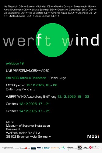 Sie startet am Freitag, dem 12. 12. mit werftwind Video +++Live-Performance+++ Projektionen mit Ilke Theurich, Evamaria Schaller, Sandra Corrigan Breathnach, Anna Grunemann, Louisa Schrimpf, Dagmar I. Glausnitzer-Smith, Lio Bramkamp, Ilka Leukefeld, Andrea Aguia, Craphone Liu, Steffan Lischka, Leonie & Larina