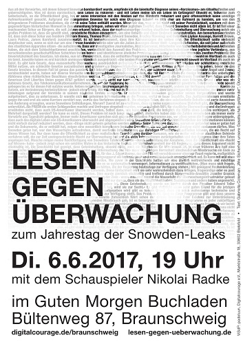 KulturPolitik „Lesen gegen Überwachung“ Von Gastbeitrag - 30. Mai 2017 0 Teilen FacebookTwitterWhatsAppLinkedinEmail Der Verein Digitalcourage veranstaltet am Dienstag, dem 6.6.2017, um 19 Uhr, gemeinsam mit dem Schauspieler Nikolai Radke eine „Lesung gegen Überwachung“ im Braunschweiger „Guten Morgen Buchladen“ im Bültenweg 87. Der Eintritt ist frei.