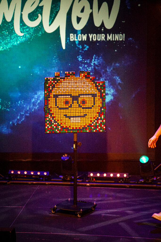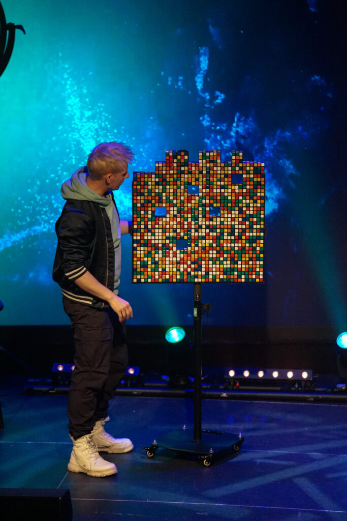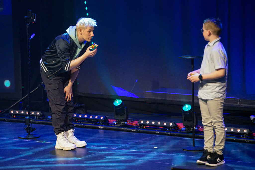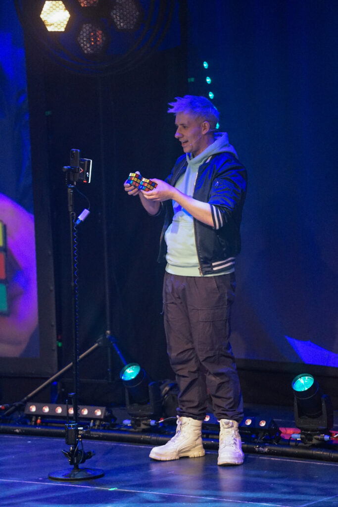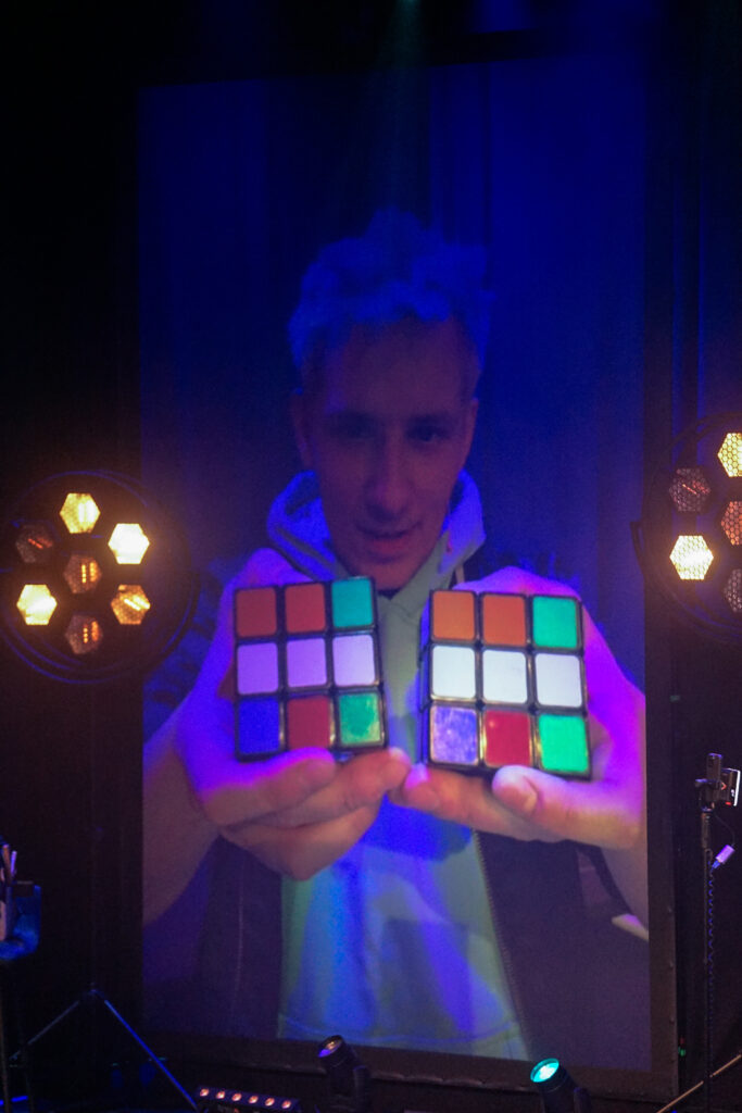 Mit scheinbarer Leichtigkeit präsentierte er eine Vielzahl unterschiedlichster Tricks – und doch war es weit mehr als reine Fingerfertigkeit. Besonders seine berühmten Kunststücke mit dem Zauberwürfel sorgten für ungläubiges Staunen. Immer wieder holte sich Mellow Unterstützung aus dem Publikum – Kinder, die gemeinsam mit ihm Teil der Magie wurden: Ein Junge direkt auf der Bühne, andere von ihren Plätzen aus, Seite an Seite mit ihren Eltern. Farben ordneten sich neu, Kombinationen entstanden wie von selbst – und zurück blieb ein Saal voller staunender Gesichter.