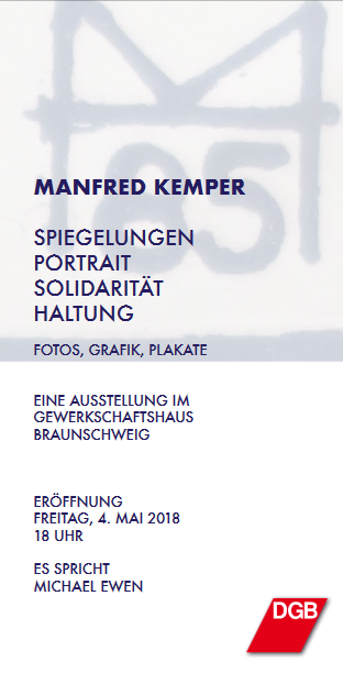 Manfred Kempers künstlerisches Werk wird nun im Gewerkschaftshaus ausge-stellt: „Spiegelungen – Portrait – Solidarität – Haltung“ heißt die Präsentation im Treppenhaus des Gewerkschaftshauses. Sie wird am Freitag den 4. Mai 2018 um 18:00 Uhr eröffnet. Es spricht Manfreds langjähriger Freund Michael Ewen.