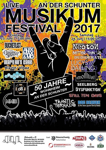 Zum 50-jährigen Jubiläum des Stundentenwohnheims an der Schunter, findet 2017 das Musikum-Festival statt! Dieses kleine, aber kultige Festival kann inzwischen auf eine über 30-jährige Tradition zurückblicken! 1980 als Jazzfestival gestartet und seit 1985 unter dem Titel „Musikum“ geführt, wurde das Konzept im Laufe der Jahre stetig weiterentwickelt und bietet zum heutigen Zeitpunkt eine breite stilistische Palette an regionalen und überregionalen Bands. Dabei werden im Sinne des ursprünglichen Konzepts neben dem breitentauglichen Musikgeschmack genauso musikalische Nischen bedient, so dass ein Besuch des Festivals stets Neues bietet und ein Erlebnis garantiert!