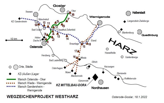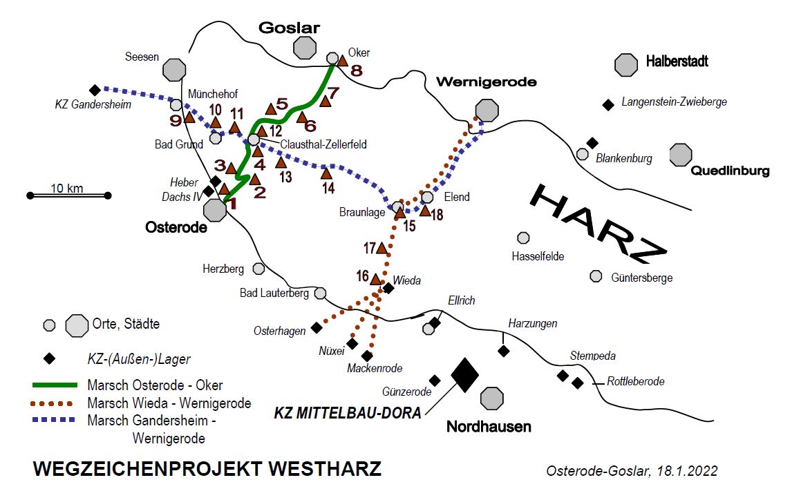 Auf dem mit 34 km größten dieser Gewaltmärsche überquerten ca. 3.500 Häftlinge aus dem KZ Mittelbau-Dora am 8. April 1945 den Harz von Osterode nach Oker.