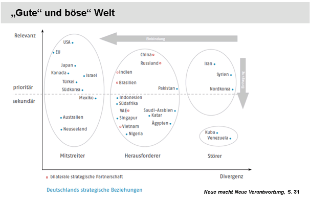 Die Studie Neue Macht – neue Verantwortung von der „Stiftung Wissenschaft und Politik“ und dem amerikanischen Thinktank „German Marshal Fund“  fordert eine Neuausrichtung der deutschen Außenpolitik mit „robustem Einsatz von Streitkräften“ gegen „Störer“.