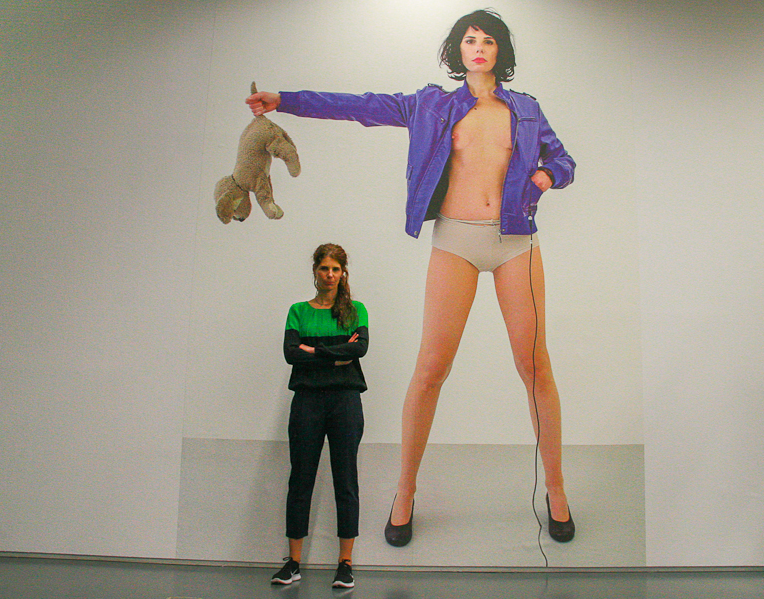 Die Gefeierte selbst hat mit erfrischend natürlichen Worten ihren großen Wurf erklärt: „Für mich ist die Arbeit ‚Großer Wurf #1’ oder ‚Selbstbildnis mit Stoffhund’ ein Schlüsselwerk der Ausstellung. Die Fotoarbeit ist eine Reaktion auf eine bekannte Abbildung von Beuys, wie er auf freiem Feld stehend, einen toten Hasen mit ausgestrecktem Arm in die Höhe hält. Es war für mich an der Zeit, ihm auf meine Art zu begegnen. Ich baute die Kamera auf, zog mich aus, die blaue Lederjacke, Pumps und die Perücke an. Ich besorgte mir ein Stofftier der Kinder und fotografierte so lange, bis der Arm lahm und vor Schmerzen taub war. Danach hatte ich mich mit Beuys versöhnt.“
