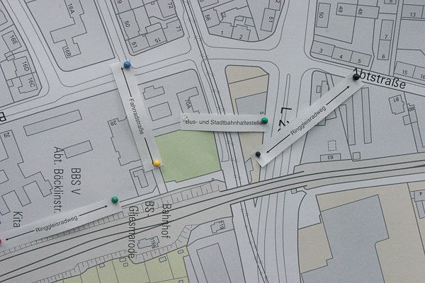 Parallel zum neuen Bahnhof Gliesmarode wird der Ringgleis-Radweg fortgeführt. Auf der grün eingezeichneten Leerfläche soll der neue Zugang zu den Gleisen mit entsprechender Infrastruktur entstehen. Foto: Klaus Knodt