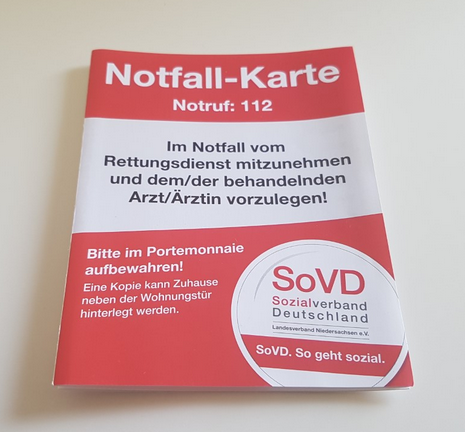 Braunschweig. Der SoVD hat Notfallkarten entwickelt, die im Beratungszentrum am Bäckerklint 8 kostenlos abgeholt werden können. Die Karten geben Helfern im Notfall einen schnellen Überblick über die wichtigsten Informationen zu der Gesundheits-Situation des Betroffenen. Neben persönlichen Daten wird in diesem Heftchen über Krankheiten, Medikamente, Patientenverfügung, Ärzte, Organspend