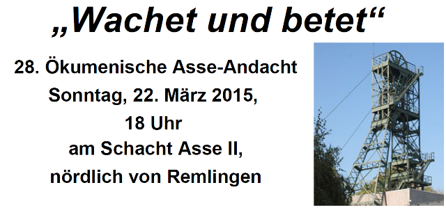 PolitikUmwelt Ökumenische ASSE-Andacht Von Uwe Meier - 18. März 2015 0 Teilen FacebookTwitterWhatsAppLinkedinEmail Einladung