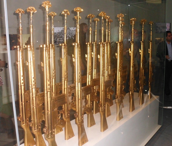Im „Museum zur heiligen Verteidigung“ in Teheran, geht es um den achtjährigen Irak-Iran-Krieg. Warum in dem eindrucksvollen Museum auch Symbole der Islamischen Revolution, wie hier die vergoldeten Gewehre mit der Nelke im Gewehrlauf, ausgestellt werden, erschließt sich dem Betrachter nicht. Vielleicht will sich die nicht überall beliebte Revolution in das hoch geachtete und ständig aktuelle Martyrium des Krieges einklinken, um ein Vorteil daraus zu schöpfen.