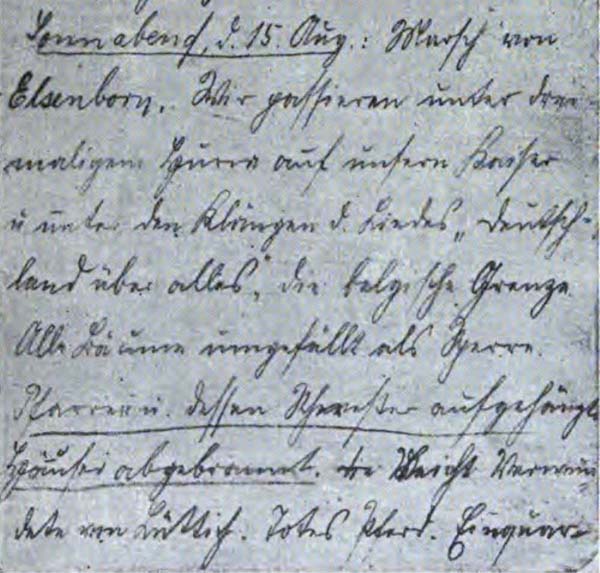 Sonnabend d. 15. Aug.: Marsch von Elsenborn. Wir passieren unter dreimaligen Hurra auf unsern Kaiser und unter den Klängen d. Liedes „Deutschland über alles“ die belgische Grenze. Alle Bäume umgefällt als Sperre. Pfarrer u. dessen Schwester aufgehängt. Häuser abgebrannt.