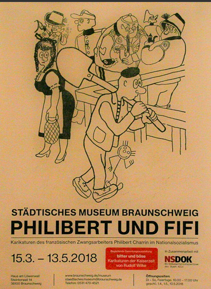 Fast 70 Jahre haben diese Kostbarkeiten in archivarischer Dunkelheit geschlummert. Das Städtische Museum Braunschweig holt jetzt erstmals alle 80 erhaltenen Zeichnungen des französischen Malers und Karikaturisten Philibert Charrin (1920 bis 2007) in die Öffentlichkeit, die er als Zwangsarbeiter der Nationalsozialisten in einem österreichischen Arbeitslager anfertigte – konspirativ, mit spitzem Stift, subtilem Humor und in ihrer entlarvenden Lächerlichkeit zersetzend. Immer wieder begleitet seine Zeichnungen, fast wie eine Signatur, das schmunzelnde Strichmännchen „Fifi“, das in seiner naiv erscheinenden Arglosigkeit kontrapunktisch die herrschenden Heldenmenschen ins Abseits des Absurden verdammt.