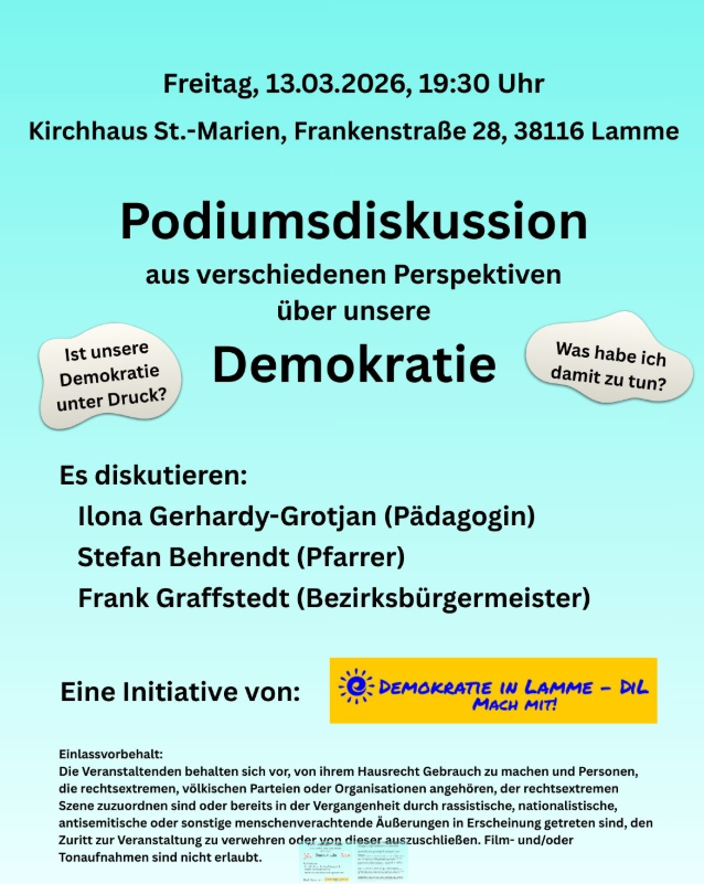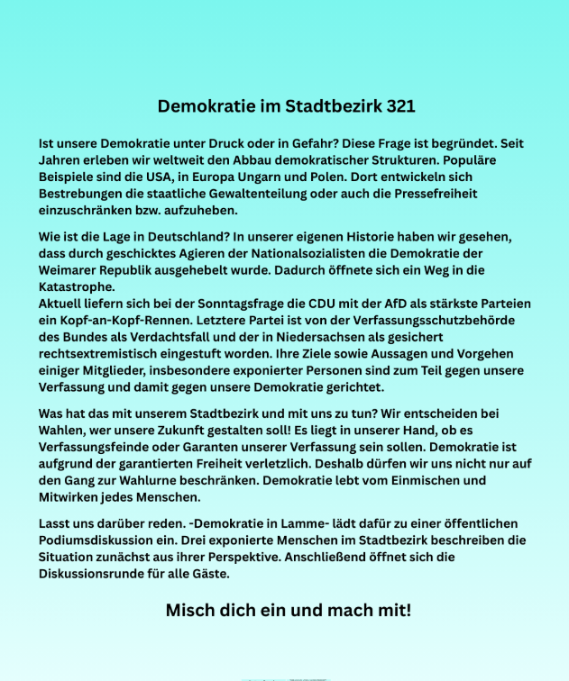 Kultur Podiumsdiskussion über Demokratie im Stadtbezirk 321 in Braunschweig. Von Gastbeitrag - 5. März 2026 0 Teilen FacebookXWhatsAppLinkedinEmail