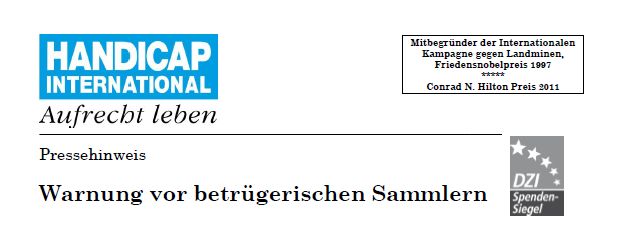 Seit vielen Monaten sind bundesweit und in den Nachbarländern – aktuell auch in Braunschweig – Sammler unterwegs, die sich meist als gehörlos ausgeben. Sie behaupten auf ihrer Unterschriften- und Spendenliste, um Spenden für Projekte von Handicap International zur Unterstützung von behinderten Menschen zu werben. Dies geschieht jedoch nicht in unserem Auftrag. Wir behalten uns daher vor, Strafanzeige zu stellen.