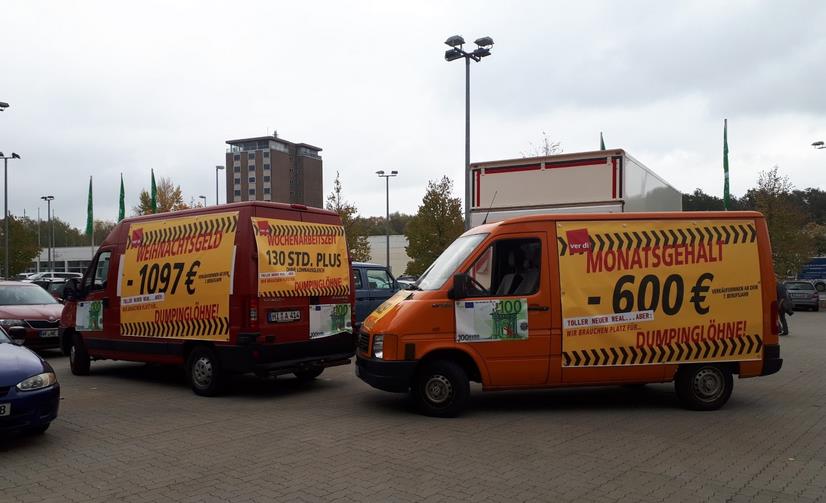 Kleine Aktion mit großer Wirkung: Zwei Transporter mit Plakaten machten die ver.di-Kritik an den Dumpinglöhnen bei real deutlich. Passend zur Eröffnung der real-„Markthalle“ am 18.10. in der Otto-von Guerike-Straße wiesen sie daraufhin, was die Tarifflucht für die Beschäftigten bedeutet: