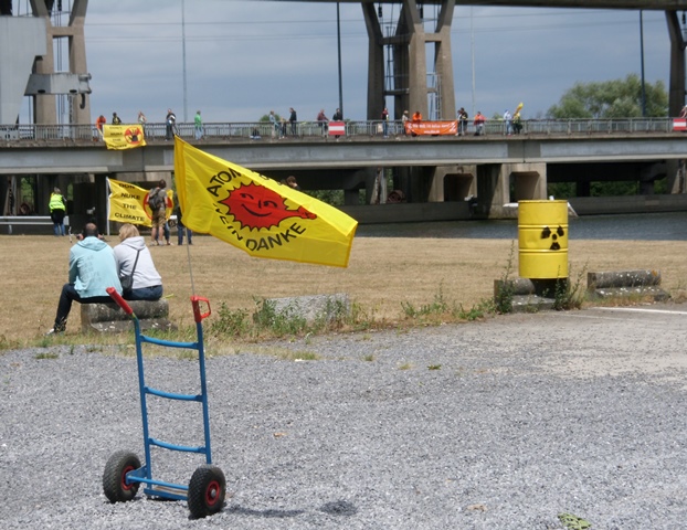 Das mahnende Atommüll-Fass vor der Brücke über die Maas