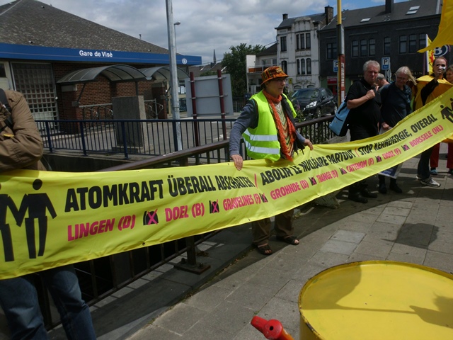 Bei der Ankunft in Vise wurden sogleich die Transparente entrollt. Natürlich ging es nicht nur um die belgischen Pannenreaktoren. Es geht gegen die lebensfeindliche Atomkraft weltweit.