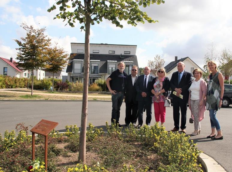 Foto: Gruppenbild am Roselies-Baum im braunschweiger Neubaugebiet: Die Belgische Delegation unter Leitung von Monsieur Daniel Tilmant, Präsident des Comitée des Souvenir (3. v. r.) im Rondell der Roselies Straße, begrüßt am 1.9.2018 von einer der privaten Baumpatinnen, Katrin B. (1. v. r.) und mir (ganz links)