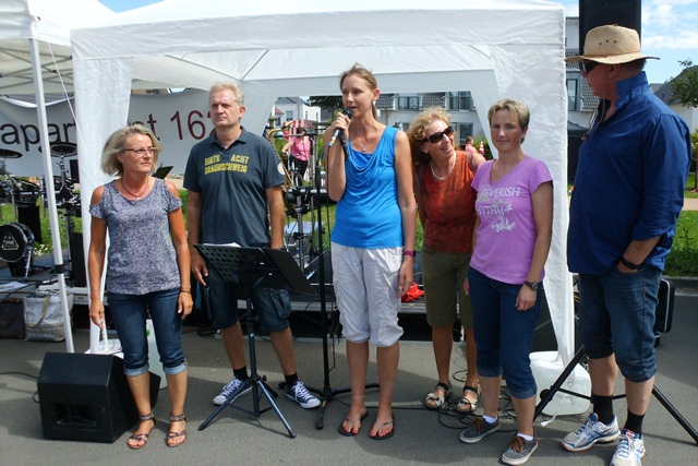 Die Party wird eröffnet. Ein Teil des Organisationsteams: Iris Jahns, Michael Jahns, Katrin Bremora, Renate Rosenbaum, Dörte Lehmkuhl , Karsten Wichert. Nicht auf dem Foto: Sybille Heinemann, Uwe Heinemann, Nele Stübner und Ann Hofmann. Besonders das Orgateam wird froh sein, dass das Fest voll gelungen war, denn die Sonne schien, die Stimmung war blendend, und alles war wohl bedacht.