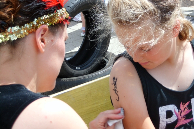 Besonders die Mädchen drängelten sich am Tattoo-Stand. Hier wird professionell eine Eidechse auf den Oberarm gezaubert (lässt sich abwaschen).