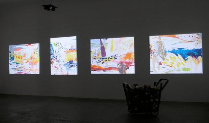 Noch bis zum 16. Juni ist im Konsumverein eine ungewöhnliche Ausstellung zu sehen, die Malerei mit Videoprojektion und Klängen kreuzt. Ungewöhnlich daran ist vor allem, dass Gemälde und Projektion nicht nebeneinander stehen sondern Malerei und Videoprojektion in einer Installation kombiniert sind und dass Bilder und Projektion von verschiedenen Künstern stammen.