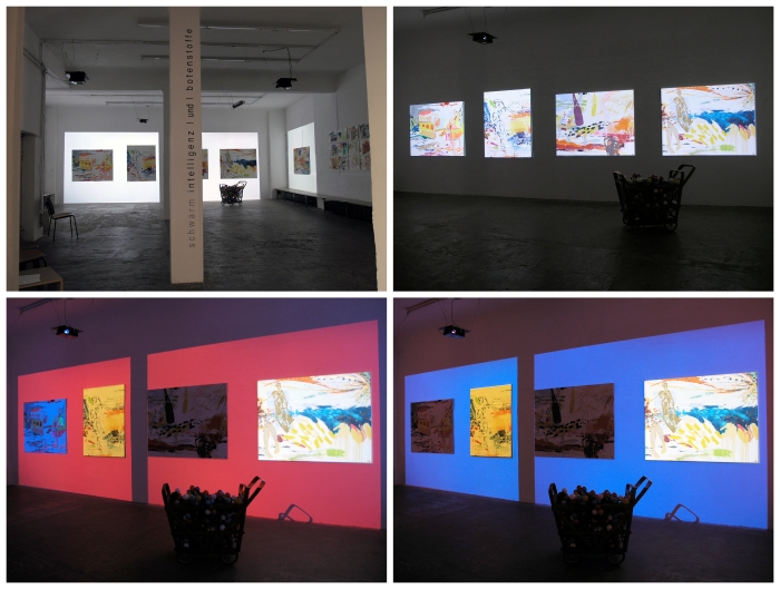 Die gestischen, halb-abstrakten Bilder und die Bildzwischenräume werden durch die Projektion in flächigen Farben ausgeleuchtet, die innerhalb einer Stunde (so lange läuft die Projektionsschleife) in unterschiedlichem Rhythmus auf die Wände geworfen werden. Beeindruckend ist die Präzision, mit der dieses geschieht. Die projizierten Farbflächen beziehen sich millimetergenau auf die Bildränder. Strahlendes Weiß erweckt den Eindruck, die Bilder würden von der Rückseite beleuchtet. Dann wieder verbirgt die Projektion einer im Bild verwendeten Farbe, diese vor dem Auge des Betrachters. Im Gegensatz zur gleichbleibenden Beleuchtung werden so immer wieder andere Stimmungen erzeugt, die Aufmerksamkeit des Auges gelenkt und auf den Bildern selbst wechseln die sichtbaren Details.