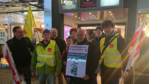 Verdi-Demonstration von Pflegepersonal vor dem Kino Universum vor Beginn des Dokumentarfilms „Der markgerechte Patient„, der am Sonntag um 11:15 wiederholt wird. Foto: Marcel Richter