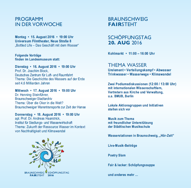 KulturPolitik Schöpfungstag 2016: „Braunschweig FAIRsteht“ das Thema Wasser Von Uwe Meier - 27. Juli 2016 0 Teilen FacebookTwitterWhatsAppLinkedinEmail