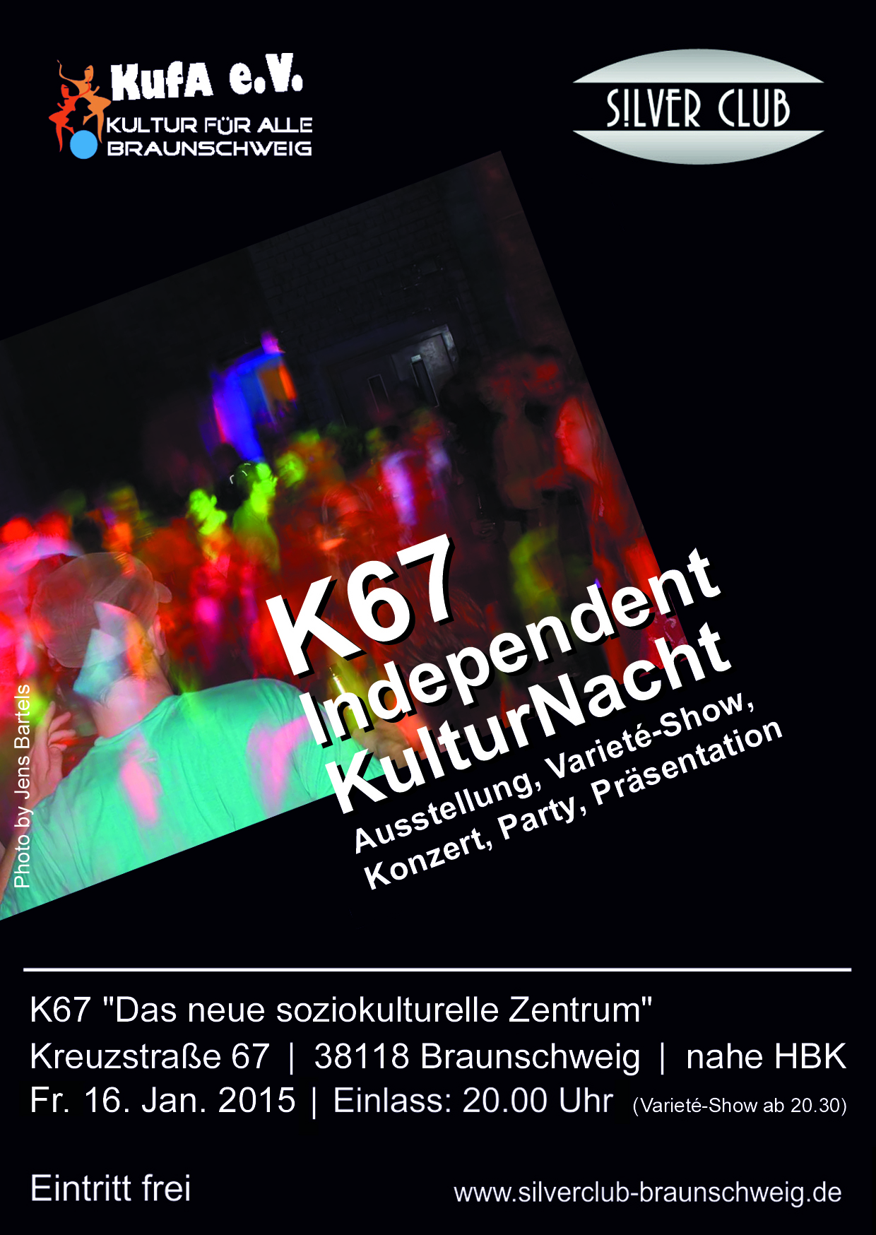 Silver Club: „K67 Independent KulturNacht“, Kreuzstraße 67, 38118 Braunschweig, Freitag, 16. Januar 2015, Einlass: 20.00 Uhr (Varieté-Show ab 20.30 Uhr), Eintritt frei