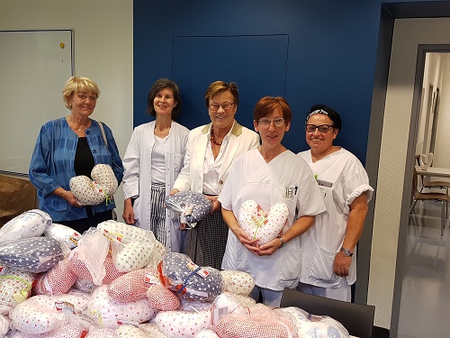 Der SoVD in Braunschweig hat 57 Herzkissen an die Abteilung Senologie (Brustzentrum) des Klinikums Braunschweig, Celler Straße, übergeben. Edda Schliepack und Marlis Bursie (beide SoVDBraunschweig) übergaben die von Frau Bursie genähten Kissen an das Team der Klinik, darunter auch Oberärztin Dr. med. Irene Hainich. Diese Kissen in Herzform lassen sich besonders gut unter den Achseln tragen und lindern bei Frauen, die wegen Brustkrebs operiert wurden, den Wundschmerz. Die Idee für solche Herzkissen für Brustkrebspatientinnen kam aus den USA. Über eine dänische Krankenschwester gelangte sie nach Deutschland. Viele Brustkrebspatientinnen nehmen das Kissen mit nach Hause und verwenden es ein bis zwei Jahre nach der Operation. Sie tragen es z.B. auch im Auto unter dem Gurt.