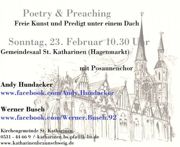 Freie Kunst und Predigt unter einem Dach? Poetry Slamer Andy Hundacker aus Berlin und Katharinenpfarrer Werner Busch wagen am kommenden Sonntag, 23.2.2014 ein Gottesdienst-Experiment. „Die Formate ‚Poetry Slam‘ und Gottesdienst passen eigentlich nicht zusammen. Dennoch stehen sich Künstler und Prediger durch ihren Umgang mit Wort und Sprache nahe“, erläutert Busch das gemeinsame Vorhaben. Verkündigung und Poesie sollen Unbeachtetes neu vor Augen stellen. Sie regen durch ihren überraschenden Blick auf das Leben und die Gesellschaft zum Nachdenken und Umdenken an, so der Braunschweiger Theologe.