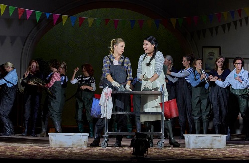 Seit Beginn der Generalintendanz von Dagmar Schlingmann, der Operndirektion von Isabel Ostermann und der Generalmusikdirektion von Srba Dinic in der vergangenen Spielzeit hat sich ein hervorragendes 14 Sängerinnen und Sänger umfassendes Ensemble entwickelt und so kann der „Fliegende Holländer“ in Braunschweig mit lediglich einem Gast – dem Holländer – gegeben werden. Mit klangvollem, heldenbaritonalem Organ wartet Jaco Venter als Holländer auf. Seine saftig kräftige Stimme macht ihn zu einem würdevollen Holländer, der ohne Probleme in der Höhe oder Tiefe sowie dem dramatischen Ausbruch blieb. Er stellt einen gealterten, verzweifelten Meereswanderer dar. Wenn er beim Kennenlernen Senta tapsig eine Tasse überreicht, statt sie zu umarmen, hat das berührendes Format. Seine Senta ist die Entdeckung des Abends! Mit Inga-Britt Andersson kommt eine junge, attraktive, blonde Sopranistin mit großer Ausstrahlung auf die Bühne des Staatstheaters. Womit sie der Holländer in den Bann zieht, bleibt unerklärlich. Liebt Senta der Liebe willen – um jeden Preis – bis zum Tod? Sie ist ein keckes Mädchen mit Selbstbewusstsein, das mit den anderen Mädels in der Fischfabrik unter Anleitung von Frau Mary Fische ausnimmt. Hat sie sich mehr vom Leben erhofft und der Holländer ist die Rettung? Sie besitzt einen nordischen, lyrisch-dramatischen Sopran, der klar und ohne Intonationsprobleme wundervoll anspricht. Die Sängerin verfügt über ausreichend Kraftreserven, um Senta auch ein dramatisches Profil zu geben. In der Ballade zeigt sie eine gute Klangbalance und präsentiert hier jubelnde Spitzentöne. Inga-Britt Andersson ist in Stimme und Spiel die ideale Senta! Mit Matthias Stier und Kwonsoo Jeon hat das Staatstheater Braunschweig zwei Tenöre unter Vertrag, die den lyrischen wie dramatischen Ansprüchen der Partien Steuermann und Erik gerecht werden.