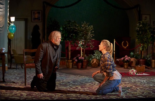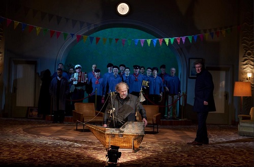 Schon vor Beginn der Oper stimmte die Regisseurin Isabel Ostermann, die seit der letzten Spielzeit am Staatstheater Braunschweig als Operndirektorin wirkt, die Zuschauer im Großen Haus mit bedrohendem Gewitter vom Band sowie Blitzen im Zuschauerraum und mit großem Segelschiffmodel in der Eingangshalle auf den „Fliegenden Holländer“ ein. Wer bei „Blitz und Donner“ an Johann Strauß Schnellpolka denkt, findet sich in Braunschweig im „Fliegenden Holländer“ wieder. Isabel Ostermann ist mit ihrer Inszenierung der romantisch gruseligen Seefahreroper eine dichte, dramatische Darstellung gelungen, die packend und nicht althergebracht ist. Der Holländer auf der Bühne des Staatstheaters wirkt alt und abgekämpft und es ist nicht nachvollziehbar, warum sich das blonde Mädel Senta unsterblich in ihn verliebt. Das Einheitsbühnenbild von Stephan von Wedel bietet eine geräumige Spielfläche und lässt sich als Empfangshalle eines Schifffahrtskonzerns interpretieren. Hier sind Dalands Schiff auf der linken Seite und das des Holländers auf der rechten Seite als Modelle zu erkennen. Eine Uhr am Bühnenportal und eine Uhr im Bühnenbild. Beide Uhren gehen gegenläufig und zeigen erst im Finale die gleiche Zeit an.