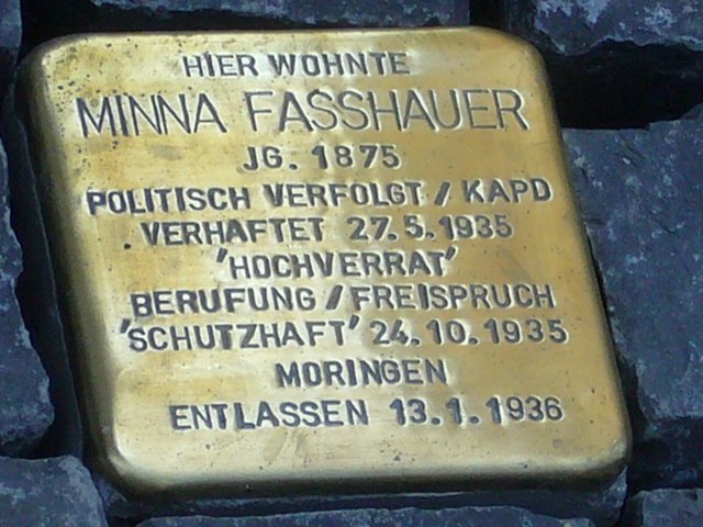 Nach Kriegsende wurde Minna Faßhauer Mitglied der VVN. Außerdem tritt sie in die KPD ein, kandidiert zu den Kommunalwahlen und wird auch in der politischen Frauenarbeit aktiv.