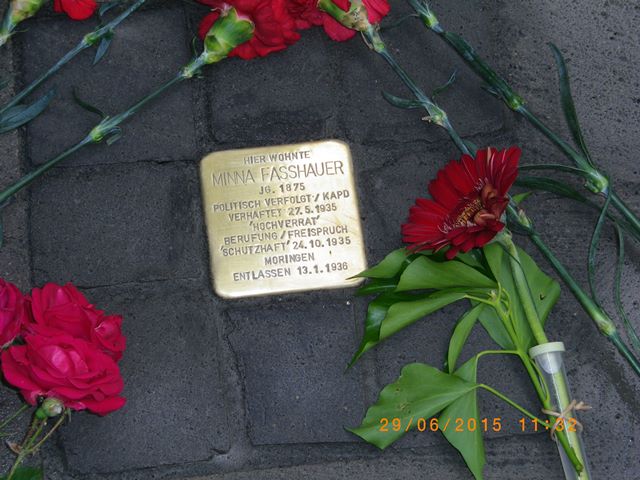 Am Montag, 29. Juni 2015, wurde für Minna Faßhauer in der Hugo-Luther-Straße 12, ein Stolperstein verlegt. Hier war ihr letzter frei gewählter Wohnort. Hergestellt wurde der Stolperstein wieder durch den Kölner Künstler Gunter Demnig, der durch Frau Boldt-Stülzebach vom Kulturinstitut auf der Verlegungsroute begleitet wurde. Beim Setzen des Steins gingen ihm Beschäftigte der Stadt zur Hand.