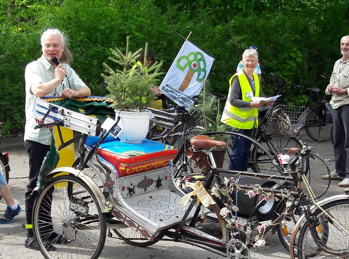 Frau Mundlos (CDU) wollte am 29. April 2018 der Einladung der „Bürgerinitiative Baumschutz Braunschweig“ zu einer Rikschatour nicht folgen. Die Tour sollte an Orte führen, an denen Bäume vernichtet wurden. Trotzdem blieb der für sie reservierte Platz nicht leer: eine kleine Fichte fuhr stattdessen bei der Baumradeltour der BI Baumschutz mit.