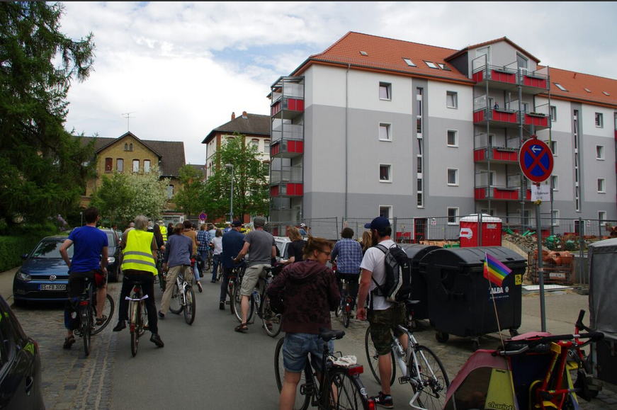 Bei schönstem Sonnenschein sammelten sich um 14 Uhr knapp 60 RadfahrerInnen auf dem Parkplatz am Eingang Süd des Hauptbahnhofs. Hier hat die Bahn Anfang März routinemäßig ein kleines „Wäldchen“ fällen lassen. „Die großen Bäume lieferten den Sauerstoff für ca. 300 Menschen. Sie waren auch Lebensraum für viele Tiere. Sogar Nachtigallen lebten hier!“, so Sabine Sambou von der BI.