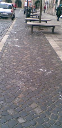 Das Streusalz wurde in mehreren kleinen Häufchen aus“gelegt“ und nicht gestreut. Die weißen Häufchen sind deutlich erkennbar.