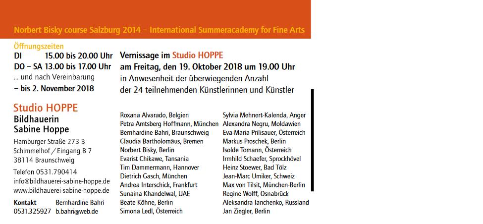 Diese Gruppe trifft sich mit ihm seitdem jährlich zu einer gemeinsamen Ausstellung – in diesem Jahr erstmals in Braunschweig, ermöglicht im Studio Hoppe, Hamburger Straße 273 B, Schimmelhof, 38114 Braunschweig. – 19.10. – 02.11.2018