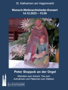 „Alle Jahre wieder“ lädt die Katharinengemeinde am 3. Advent zusammen mit dem Braunschweiger Musiker Peter Stoppok zu einem adventlichen Wunschkonzert in die Kirche am Hagenmarkt ein. Am 14. Dezember zwischen 15 und 18 Uhr ist freier Eintritt und es besteht die Möglichkeit, spontane Lied- und Melodiewünsche zu äußern, die Stoppok – gerne zum Mitsingen, soweit das Gedächtnis reicht – an der Orgel erklingen lässt. Eine Tasse Tee zum Aufwärmen und Plätzchen stehen bereit.