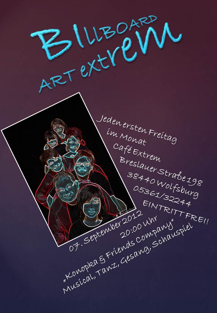 Die Wolfsburger Kulturwüste … *räusper* … -landschaft hat ein neues Gewächs: „Billlboard – ART extrem“! Jeden ersten Freitag im Monat Kleinkunst im Café Extrem. Eine Wundertüte, in der einfach alles stecken kann; Singer-/Songwriter, Bauchtanz, Feuerkunst … Ich freue mich, zur Premiere die „Konopkas“ begrüßen zu dürfen, einen Musical-/Show-Truppe, die … aber lasst Euch überraschen. Freier Eintritt!