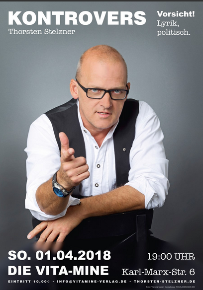 Am Abend des 1. April, dem Osterfeuer zum Trotz, geht der Braunschweiger POLIT-POET in der VITA-MINE auf seine ganz persönliche lyrische Zeitreise. Politische Lyrik aus nunmehr 30 Jahren kommt an diesem Abend, nach der Ausstellungseröffnung auf den Tisch. Stelzner, über dessen Texte sein Freund Diether Dehm einst folgendes in einem Vorwort erklärte: