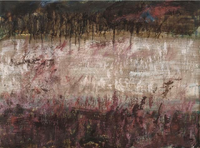 ästhetischem Kontext faszinieren. Auf die Leinwände werden mit großen, groben Pinselstrichen wilde, lebendige Landschaften geformt, die sowohl Ruhe als auch Dynamik ausstrahlen. Wie in dem Bild „Ockergrund“, bei dem Thea Pini Farbstoffe direkt aus einem Flussbett entnahm um ihr Werk zu malen. So verwächst der Fluss mit dem Kunstwerk.