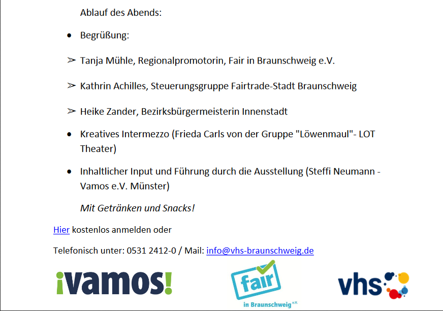 Im Hinblick auf die anstehende Fußballweltmeisterschaft 2018 bringt Fair in Braunschweig e.V. und die VHS Braunschweig die Ausstellung „TrikotTausch – Die zwei Seiten der internationalen Sportbekleidungsproduktion“ in Kooperation mit Vamos e.V. Münster nach Braunschweig.