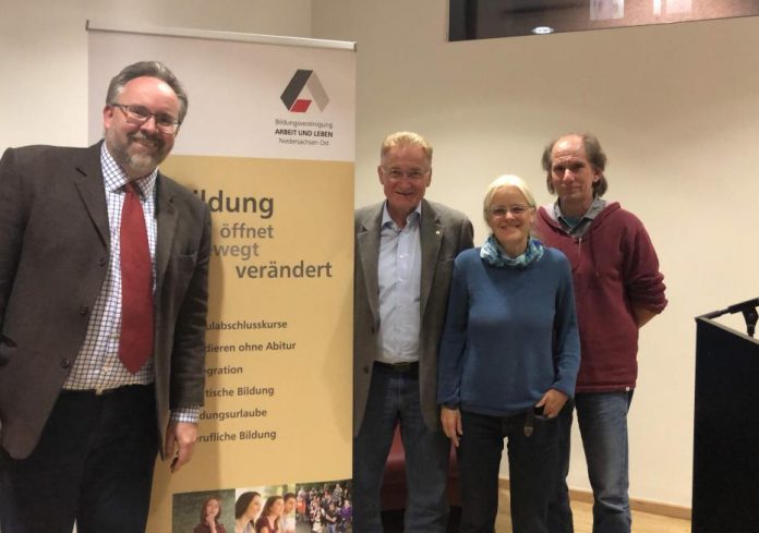 Foto: Wolfgang-Armin Rittmeier (Regionalleiter ARBEIT UND LEBEN), Uwe Fritsch (Vorsitzender des BR VW Braunschweig), Ulrike Herrmann (TAZ) und Andreas Klepp