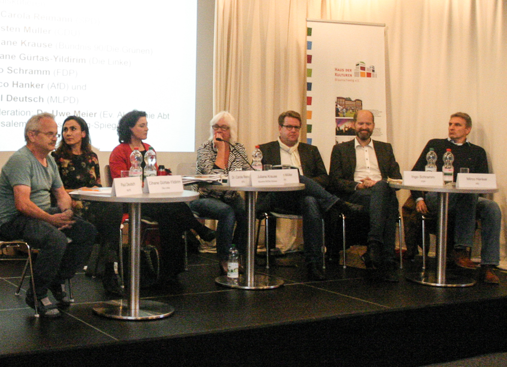 Unter der Moderation von Uwe Meier (Ev. Akademie Abt Jerusalem und braunschweig-spiegel.de), diskutierten von links: Paul Deutsch (MLPD), Cihane Gürtas-Yildirim (Die Linke), Dr. Carola Reimann (MdB, SPD), Juliane Krause (Bündnis 90/Die Grünen), Carsten Müller (MdB, CDU), Ingo Schramm (FDP), Mirco Hanker (AfD). Foto: klaus.knodt@arcor.de