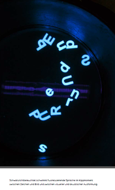 Sprachmediums erweitert und den Ort neu erfahrbar macht. Sie werden eine mit Wasser gefullte Wanne installieren, die sich von einem in den anderen Raum erstrecken wird. Durch Schwarzlicht beleuchtet schwimmt fuoreszierende Sprache imKippmoment zwischen Zeichen und Bild, sowie zwischen visueller und akustischer Ausformung. Ein kunstlerischer Dialog, der sich zwischen einer eigens fur die Räume kreierten Soundkulisse und dem Sprachmedium entspinnt, vermag unmittelbar die Sinne anzusprechen und sie zu erweitern. Gleichzeitig bleibt der Zugang zur Kunst aufgrund des sinnlich-spielerisch-experimentellen Charakters fur jedermann offen.